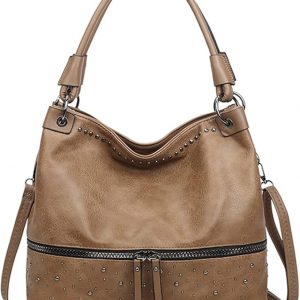 Vintage Hobo Shoulder Bag for Women Soft Leather Bucket Tote Bag Fashionable Structured Purse with Rivet Detail