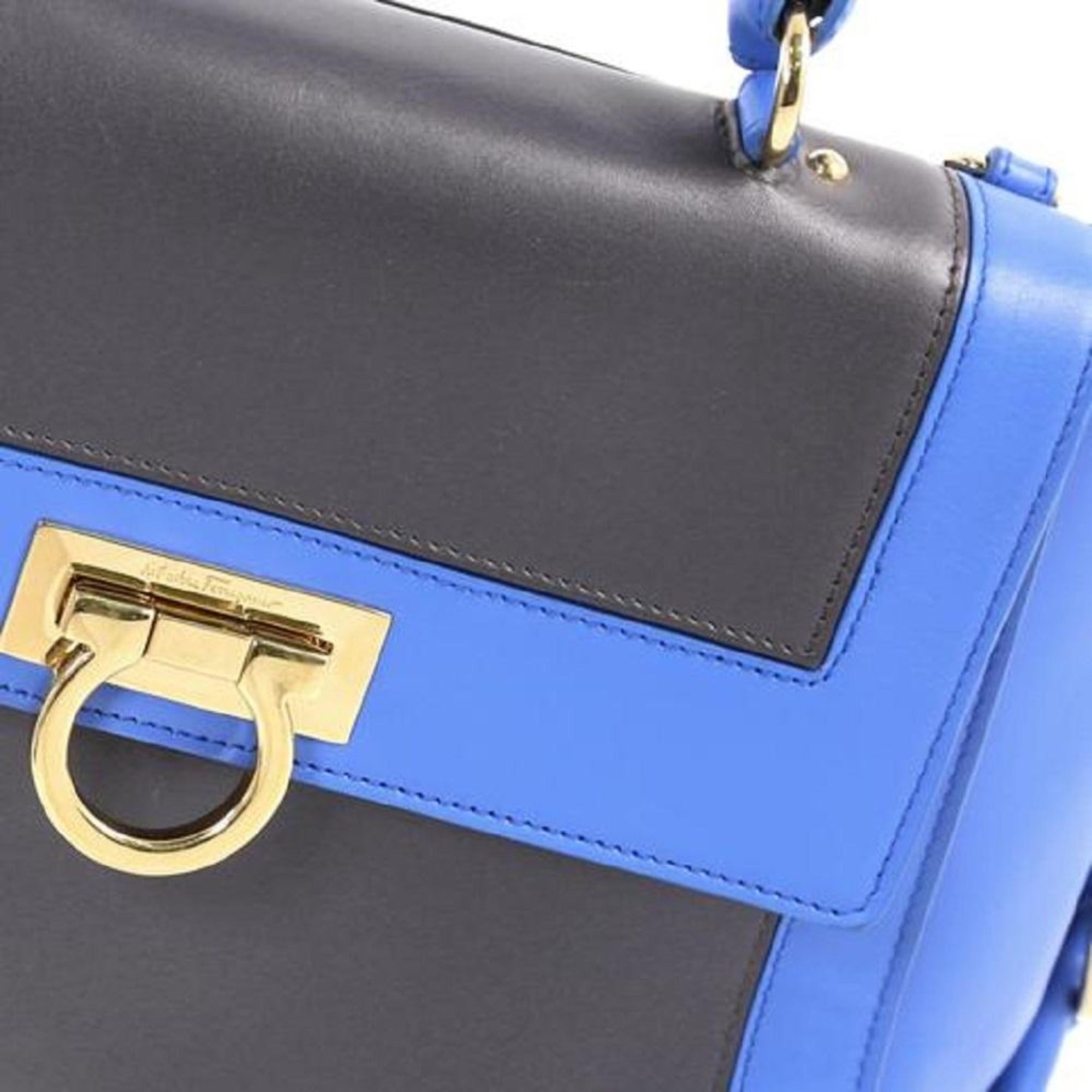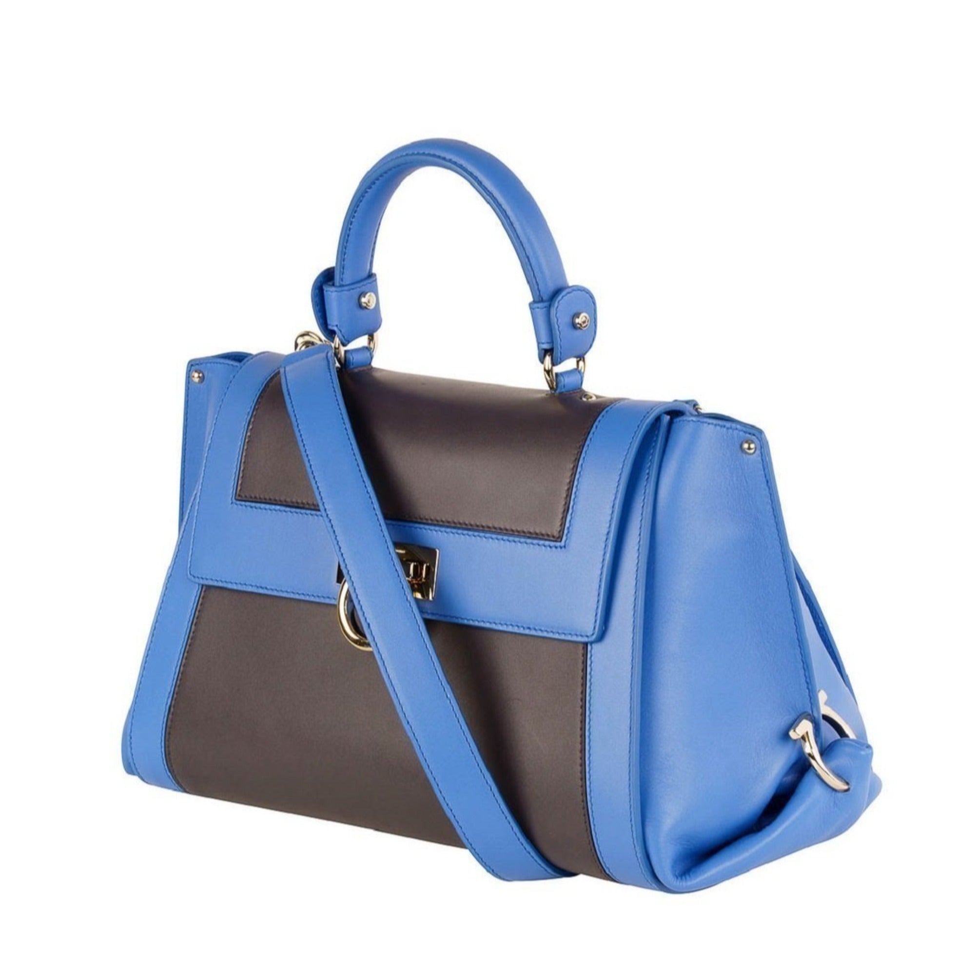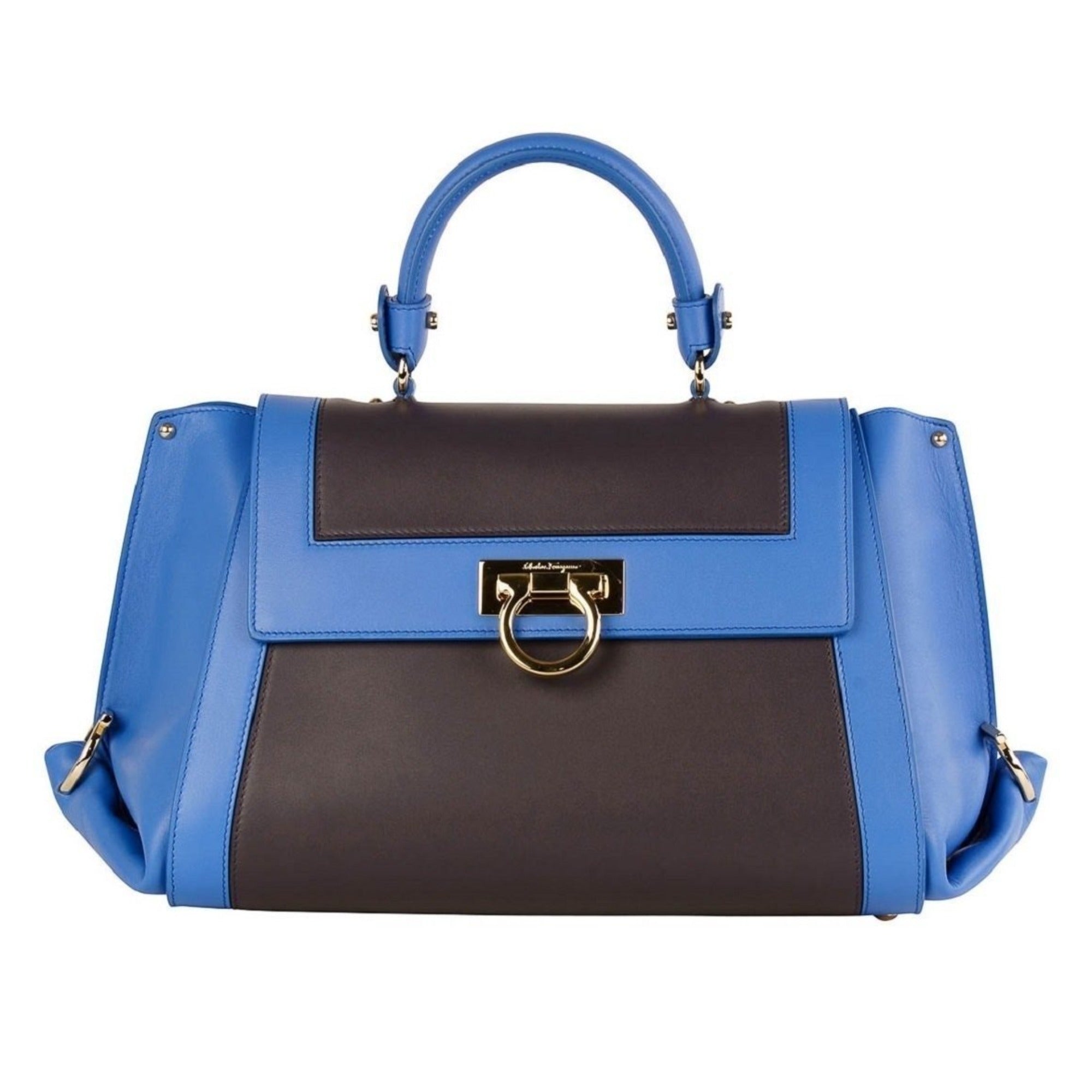 This Salvatore Ferragamo bag is classically chic in the purest form. It will add a pop of color and spunk to your outfit, perfect for day or night. Smooth calfskin leather with silver hardware. Beautiful blue paired with deep gray colored leather.