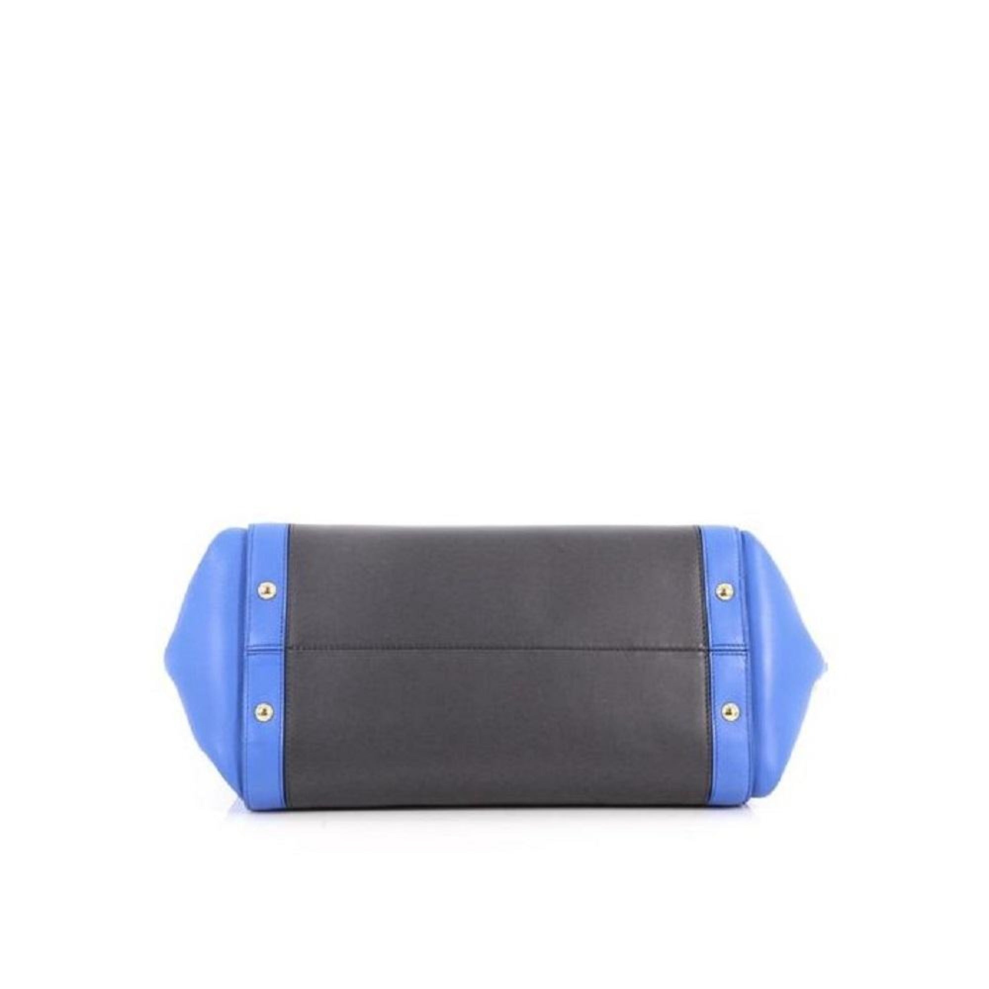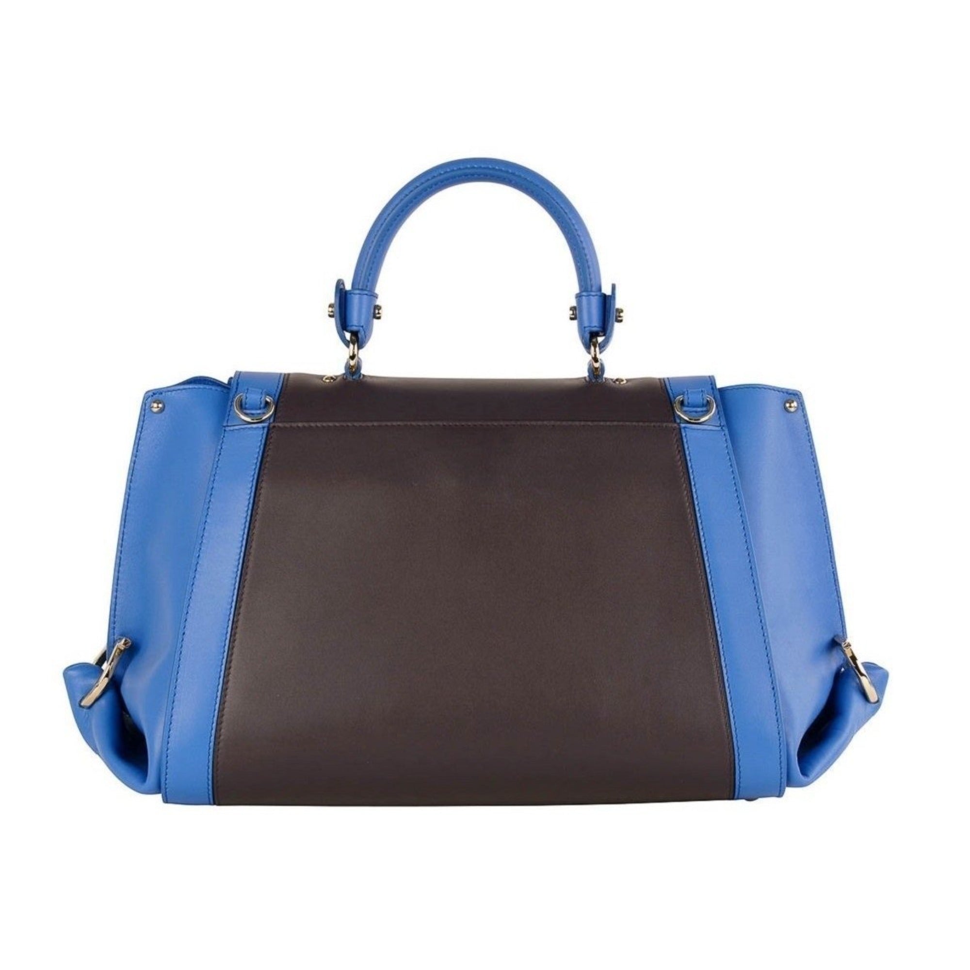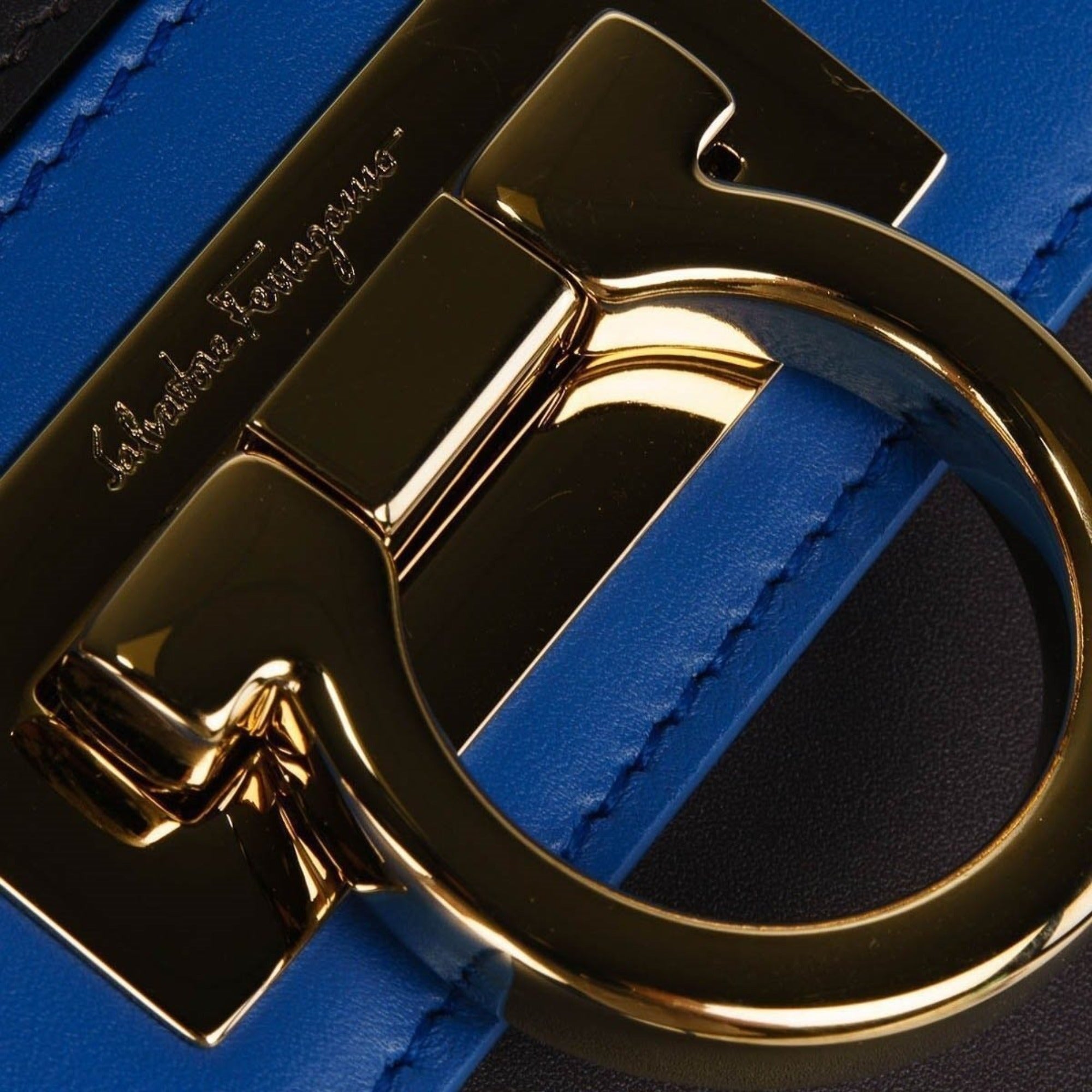 This Salvatore Ferragamo bag is classically chic in the purest form. It will add a pop of color and spunk to your outfit, perfect for day or night. Smooth calfskin leather with silver hardware. Beautiful blue paired with deep gray colored leather.