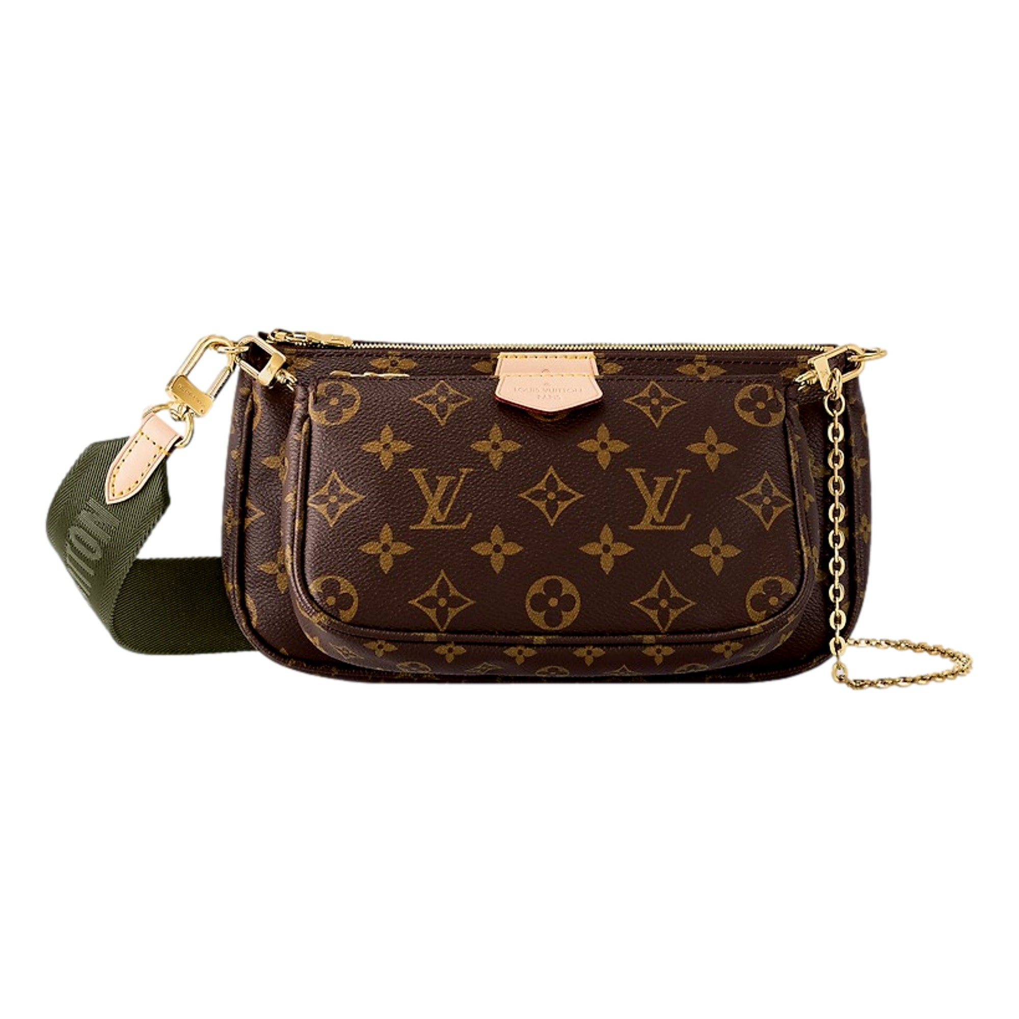 The adjustable khaki jacquard strap, adorned with signature Louis Vuitton embroidery and finished with gleaming gold-tone hardware, adds a bold, urban edge while ensuring supreme comfort and wearability. Whether worn as a crossbody, shoulder bag, or carried as separate clutches, this piece adapts seamlessly to every occasion.